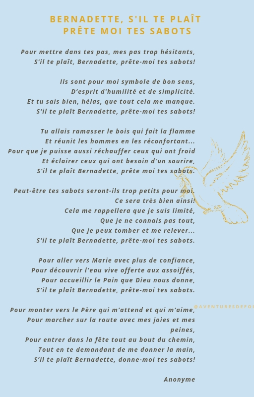 En cette fête de Sainte Bernadette, rendons grâce à Dieu pour celle qui ne cesse de visiter la Terre et de nous enseigner l’humilité de l’annonce par la simplicité d’une vie donné au Christ. Que le Père de toute éternité ne cesse de raviver en nous le souffle de l’Esprit de notre Baptême, pour que le Nom de Jésus d’Orient en Occident ranime la Terre.