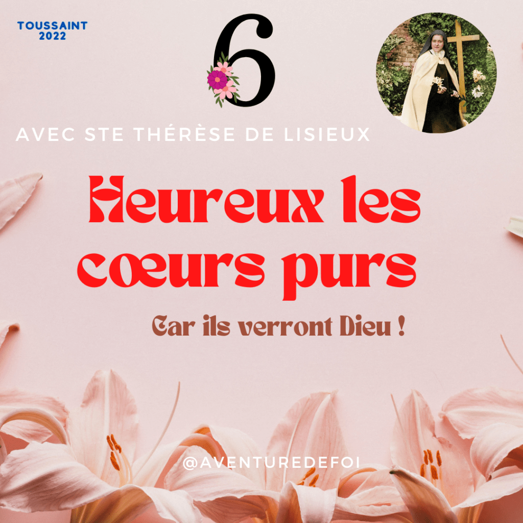 Dieu notre Père, Tu t’es donné, tu te donnes pour que nous puissions te connaître et te contempler, ici et maintenant, sur terre et au ciel. Fais-nous la grâce d’un cœur pur pour que nous puissions regarder au-delà des apparences, plus loin que nos fautes et découvrir ton Amour. Qu’à l’exemple de sainte Thérèse de Lisieux, nous nous laissions porter par Jésus ton fils, notre sauveur qui nous conduira jusqu’à toi, dans ton royaume éternel. Amen