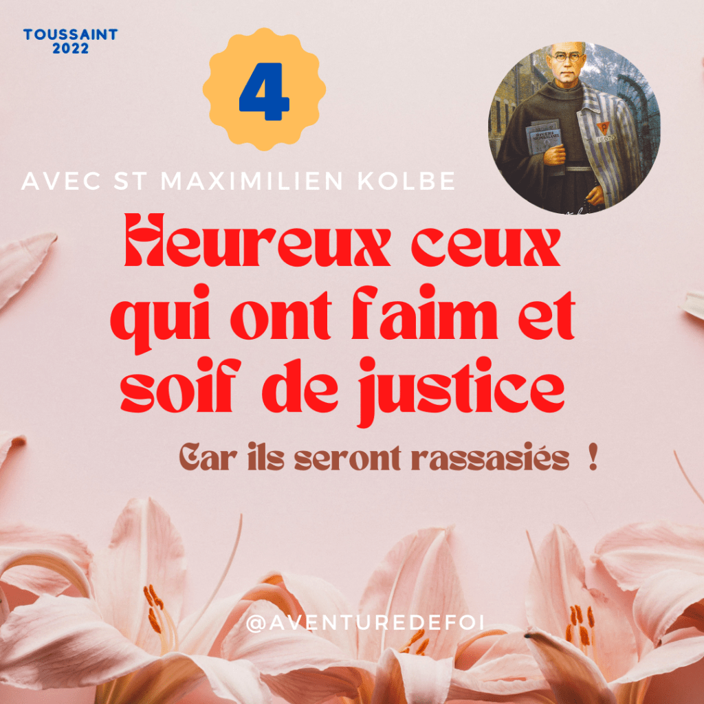 Et c’est tout l’exemple de notre compagnon du Jour Saint Maximilien Kolbe. Si un homme dans l’histoire a vraiment pris au pied de la lettre cette béatitude c’est lui, il a choisi de se sacrifier pour épargner un père de Famille de l’horrible sentence de mourir de faim et de soif. Parce que ce choix des 10 condamnés, n’était qu’horreur et arbitraire, Saint Maximillien-Marie a choisi la Justice auprès de Dieu, la Justice avec Dieu. Son martyr est édifiant mais la justice dont il s’est posé l’instrument est l’exemple même que cette œuvre de Dieu est salvatrice pour tous. Ses 9 autres compagnons de châtiments, plongés dans cette Justice Miséricordieuse de Dieu, ont vécu cette agonie dans la prière et l’assurance qu’un Dieu si Juste et si Miséricordieux est l’alpha et l’Omega de leur vie. Saint Maximillien-Marie lui a tenu jusqu’au bout rempli de Dieu, en rendant témoignage mais surtout en laissant Dieu agir à travers lui. La justice donc pourrait très bien être aussi cette lumière qui jaillit des ténèbres, ou encore cette propension en toute chose à se laisser avoir du faible pour cet autre qui est à côté de moi.