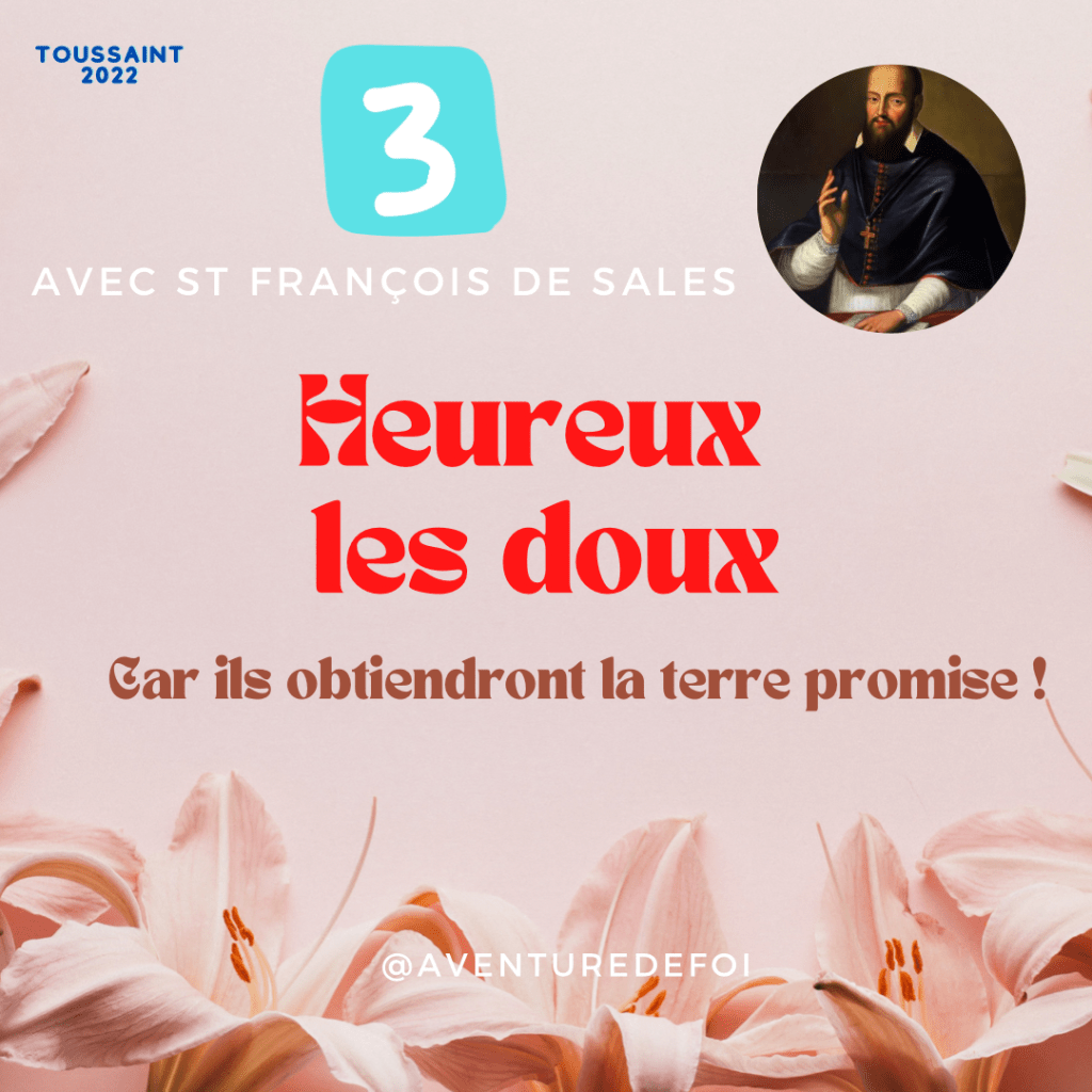 Le doux , comme à chaque fois dans l’évangile c’est plus qu’une petite voix ou une attention douce, c’est le choix de dépenser nos réactions humaines pour choisir inlassablement l’évangile comme guide et notre maître pour modèle car lui est doux et humble de cœur. Le doux semble faible, une carpette mais il tire sa force dans sa foi, que Dieu aimant l’Homme lui aussi doit avoir du faible pour eux. C’est un effort du quotidien, mais à qui suit le Christ sur cette voie de douceur et de bonheur est donné un lieu où nulle blessure ne peut cicatriser, où nulle injustice ne peut être corrigée ; un lieu où collé au cœur de notre Sauveur nous pouvons trouver le repos. N’est ce pas en nous, en notre âme connectée à Dieu que se trouve la Terre promise. Être doux ce n’est pas ne pas s’énerver, ne pas être Frustré c’est le dépasser par amour de Dieu et de ses frères.