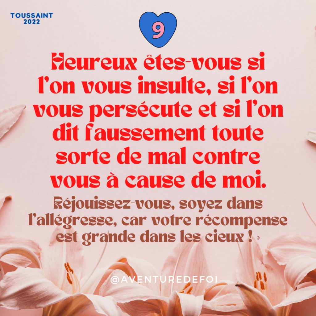 Cette 8ème béatitude est déroutante : qui accepterait d’être persécuté pour connaître le bonheur ? Pas grand monde. Et pourtant, Jésus est clair : si nous connaissons la persécution, alors nous avons dès aujourd’hui le royaume des Cieux à notre portée. Oui, notez bien : cette béatitude est, avec celle des pauvres de cœur, au présent. Comme pour nous dire : si aujourd’hui, tu connais le malheur, si aujourd’hui, tu te sens seul, dérouté par les gens, les évènements et que tu ne vois pas le bout, garde confiance : tu vis déjà le bonheur du ciel sur la terre !