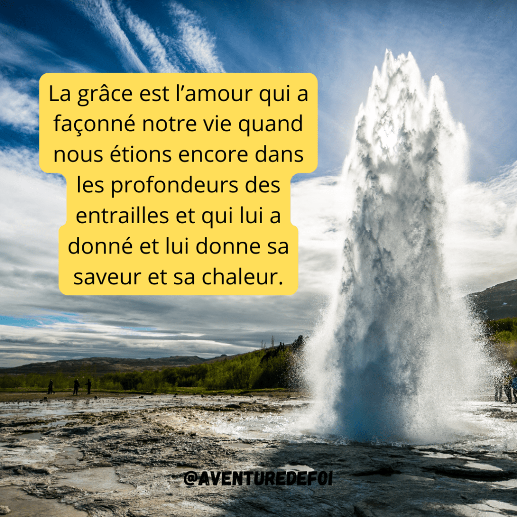 La grâce, c’est un peu comme un geyser : une source d’eau chaude qui jaillit avec force des profondeurs pour s’élever jusqu’au ciel et abreuver la terre. La grâce est l’amour qui a façonné notre vie quand nous étions encore dans les profondeurs des entrailles de notre mère et qui lui a donné sa saveur et sa chaleur. Tout vient de la grâce et tout va à elle parce que tout a été fait par amour et pour amour.