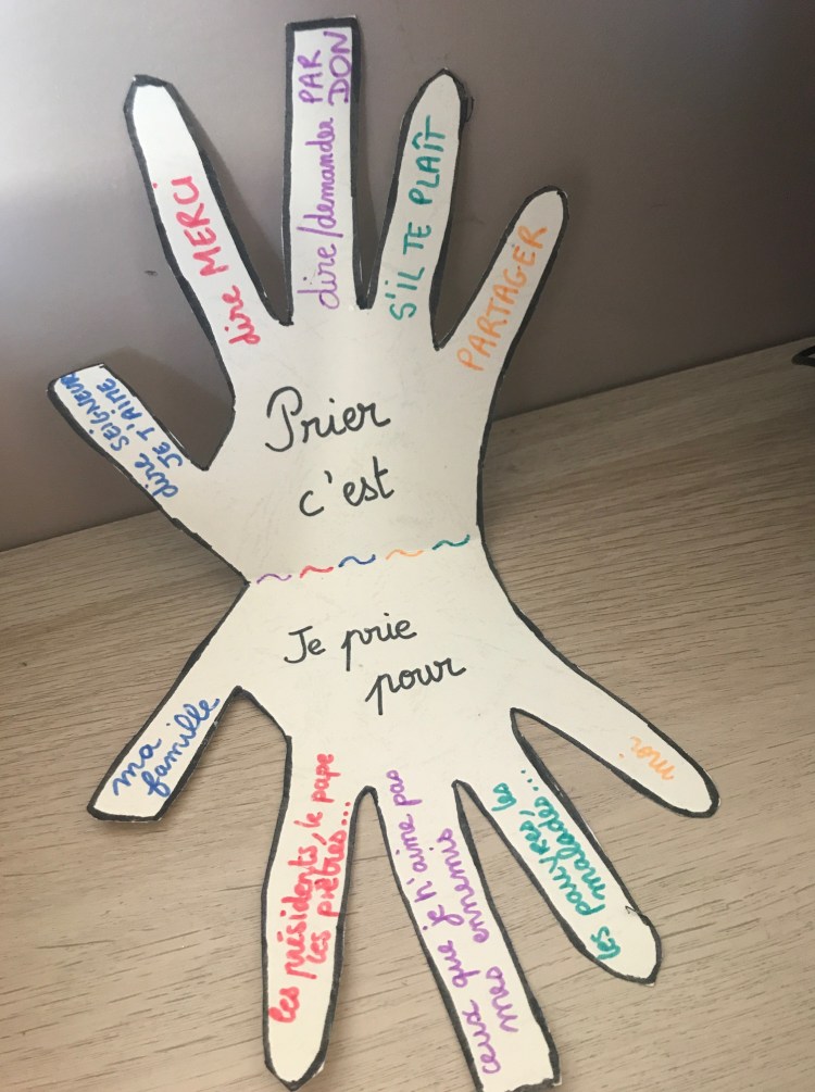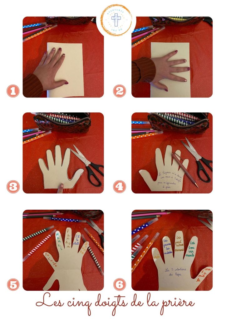 4) Ecrire sur l’extérieur « le Seigneur m’a donné une main à cinq doigts pour m’apprendre à prier »