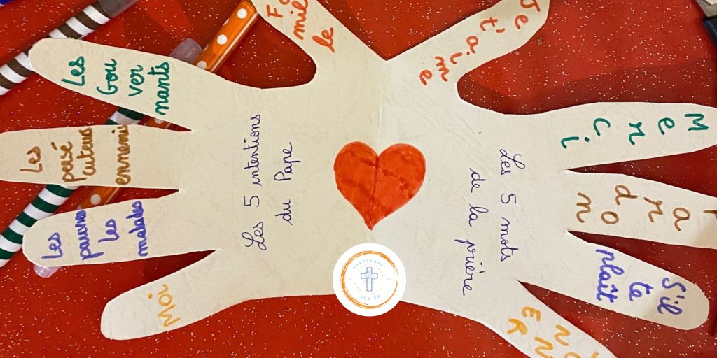 6) Retourner la main. Ecris sur chaque doigt les 5 intentions du Pape :